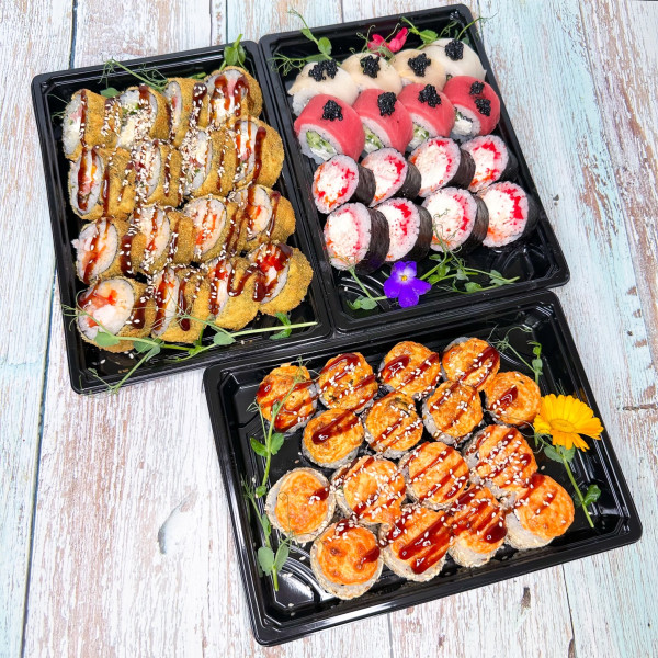 Филадельфия дуэт, икорный краб, запеченный с курочкой, мидийный, ницца темпурный с креветкой,жареный с тунцом и кальмаром