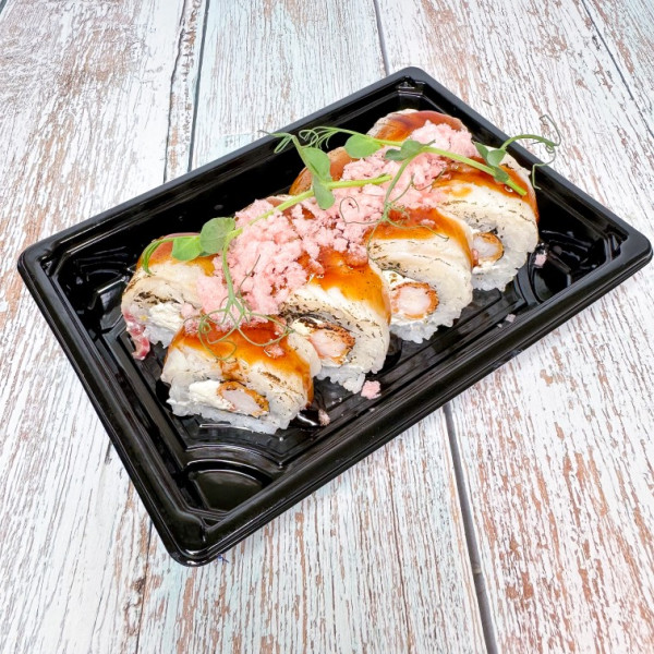 рис, нори, креветка жареная, сыр, морской окунь опаленный, унаги соус, креветочные чипсы украшение