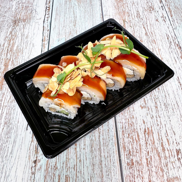 рис, нори, огурец, омлет тамаго, сыр креметте, филе эсколара х/к, унаги, миндаль лепестки